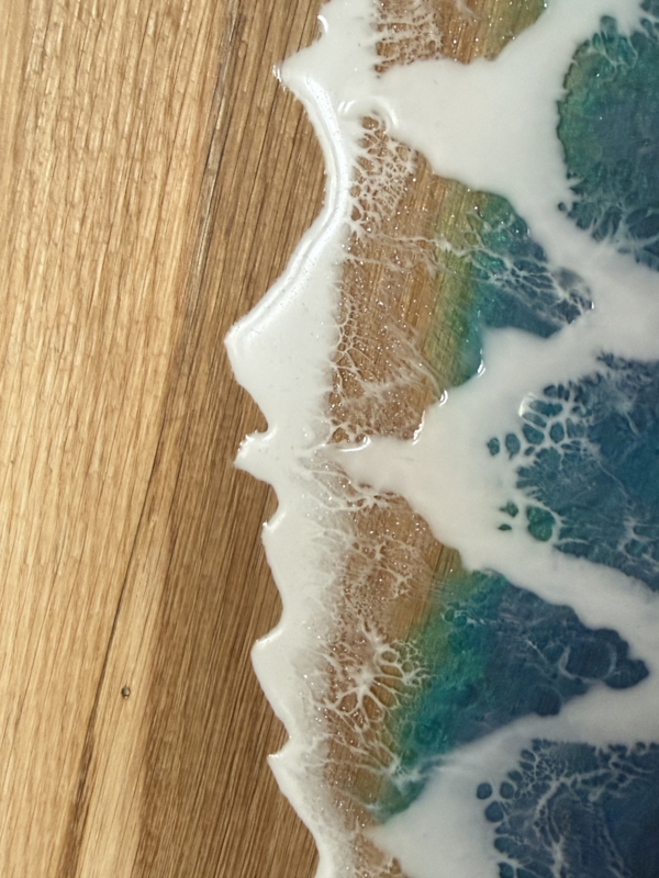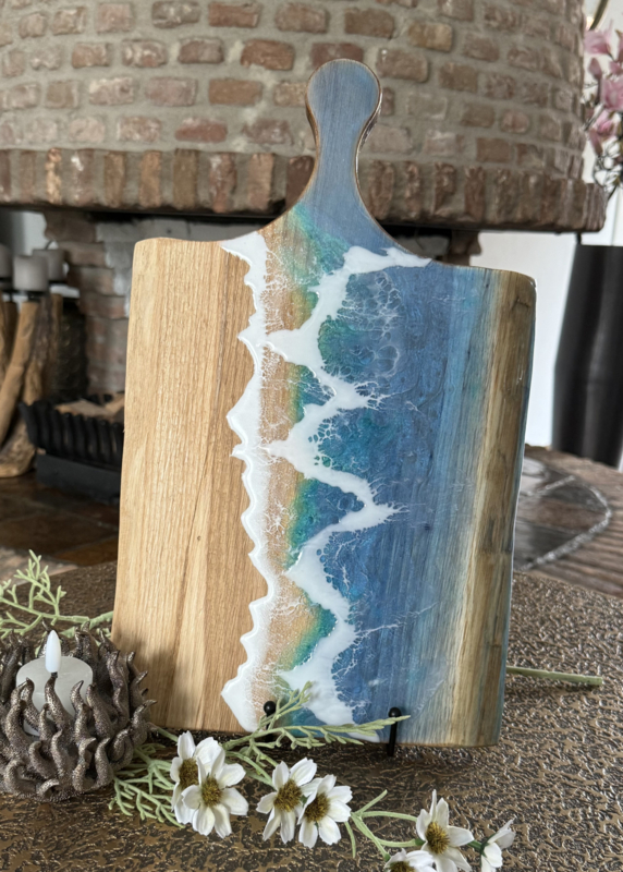 Deze prachtige eikenhouten borrelplank is met de hand gegoten en voorzien van een uniek dubbele zee-effect in diepblauw en groen. Iedere plank is een kunstwerk op zich en geen twee planken zijn exact gelijk, dat maakt jouw exemplaar écht uniek. Perfect voor gezellige borrelavonden of als stijlvol cadeau.