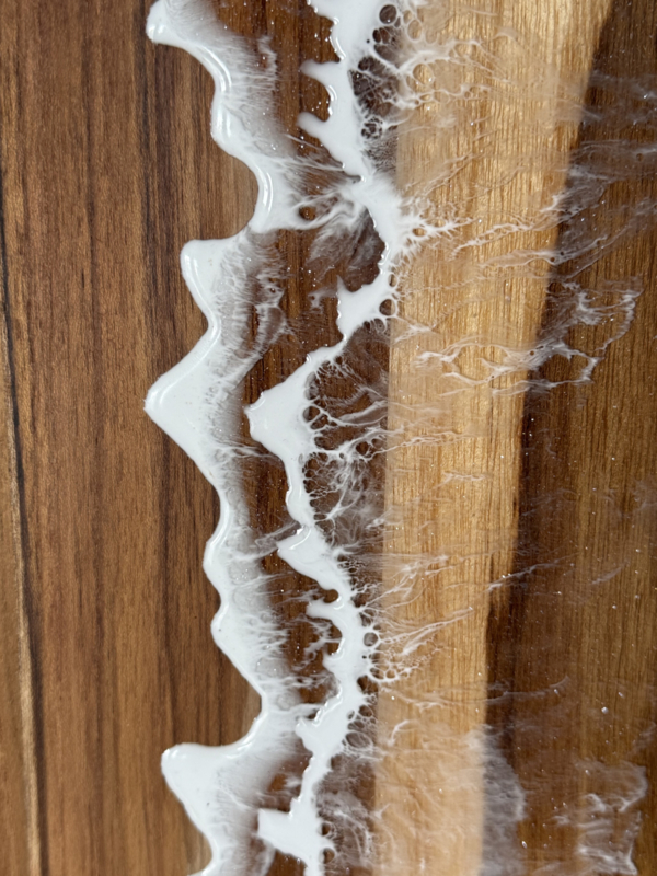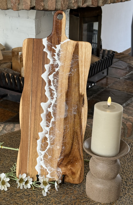 Deze elegante borrelplank is met de hand vervaardigd uit hoogwaardig teakhout en afgewerkt met een schitterende epoxylaag met een hele lichte glitter gecombineerd helderwitte tinten. De epoxy heeft een subtiel dubbele golfpatroon, waardoor het lijkt alsof een witte branding sierlijk over het hout stroomt. De natuurlijke tekening van het teakhout vormt daarbij een prachtig contrast en geeft de plank een warme, verfijnde uitstraling.